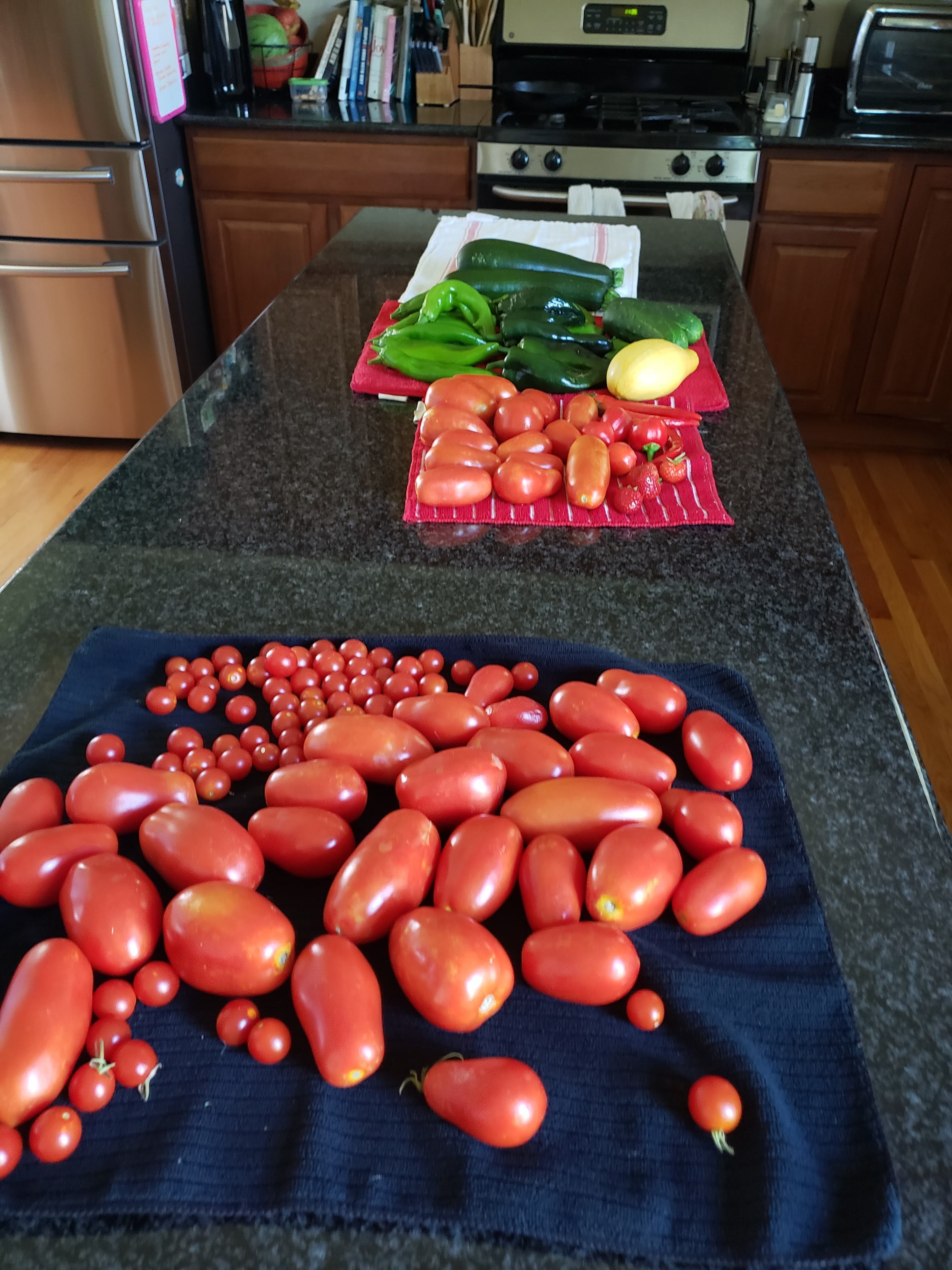 In my experience so far, the best way to keep tomatoes fresh is on the vine. Picking tomatoes at the peak of blood red perfection is the reason to grow them, of course! No store-bought ‘maters can ever develop that kind of flavor turning red on a shelf. Once the tomato treasure is so red you’ve no choice but to pick them or lose them, give them a quick water rinse and dry, and then let them vegetate on a towel in the open. Mine sit on a soft mat on the kitchen island. My youngest daughter will graze the Super Sweet 100s like candy; Nana, too. If we don’t eat them or use them fast enough, and they start to pucker, I will cook them into sauce or soup, or freeze them whole until needed.