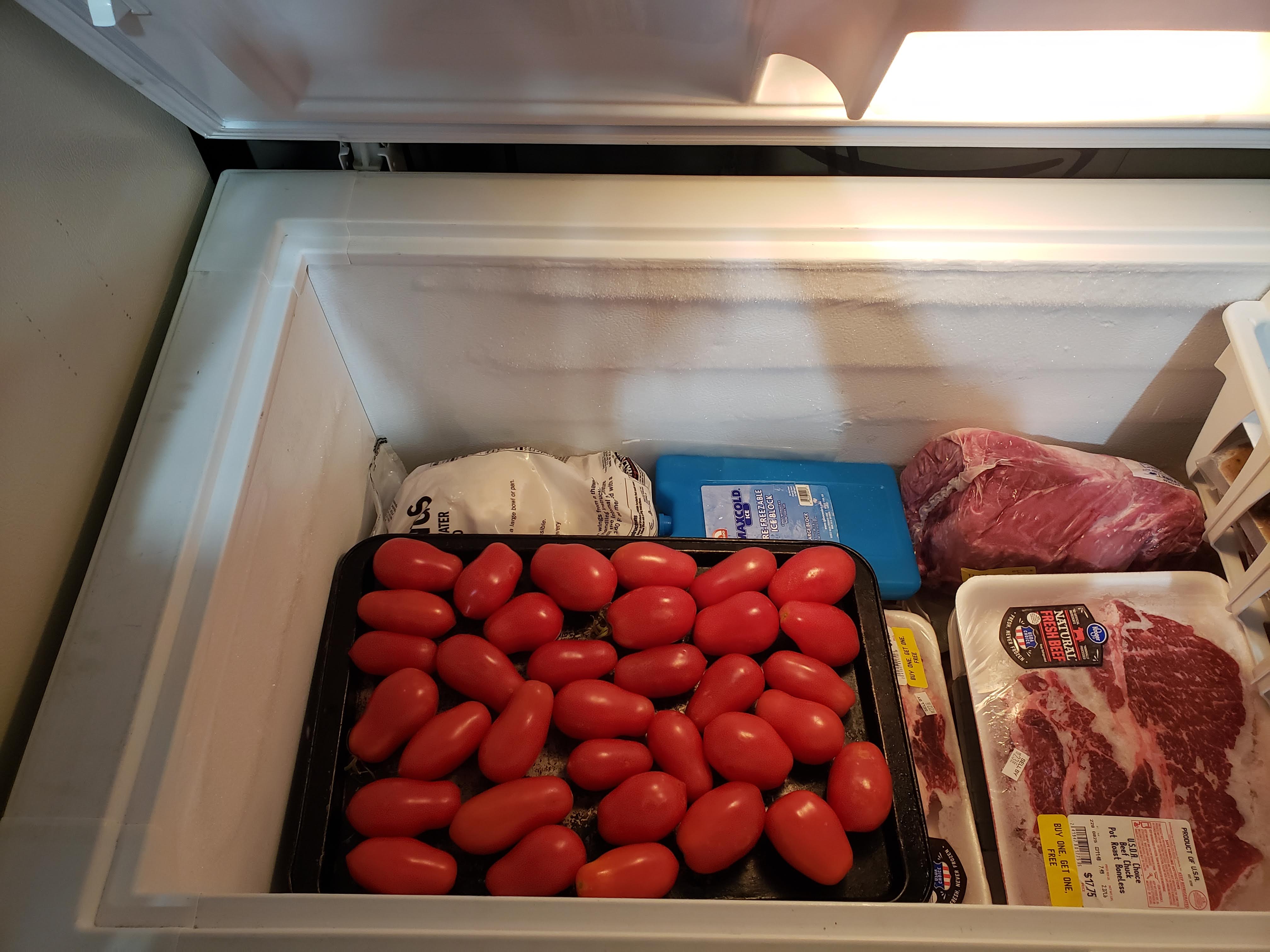 This summer I’m trying out a new strategy for the full-size tomatoes. Since cooking isn’t really my jam, the thought of spending several sweaty hours alternating over boiling and freezing water, covered to my elbows in seeds and slime and skins, and getting blisters from the coring utensil, all just to freeze ONE BATCH of tomatoes, almost makes the damn things not worth the effort. I can get decent sauce at the store for a couple of dollars and no clean up. So I found some innovative simple ideas online that are helping me maintain my love for my tomato bounty. I’m freezing them whole using this methodology: