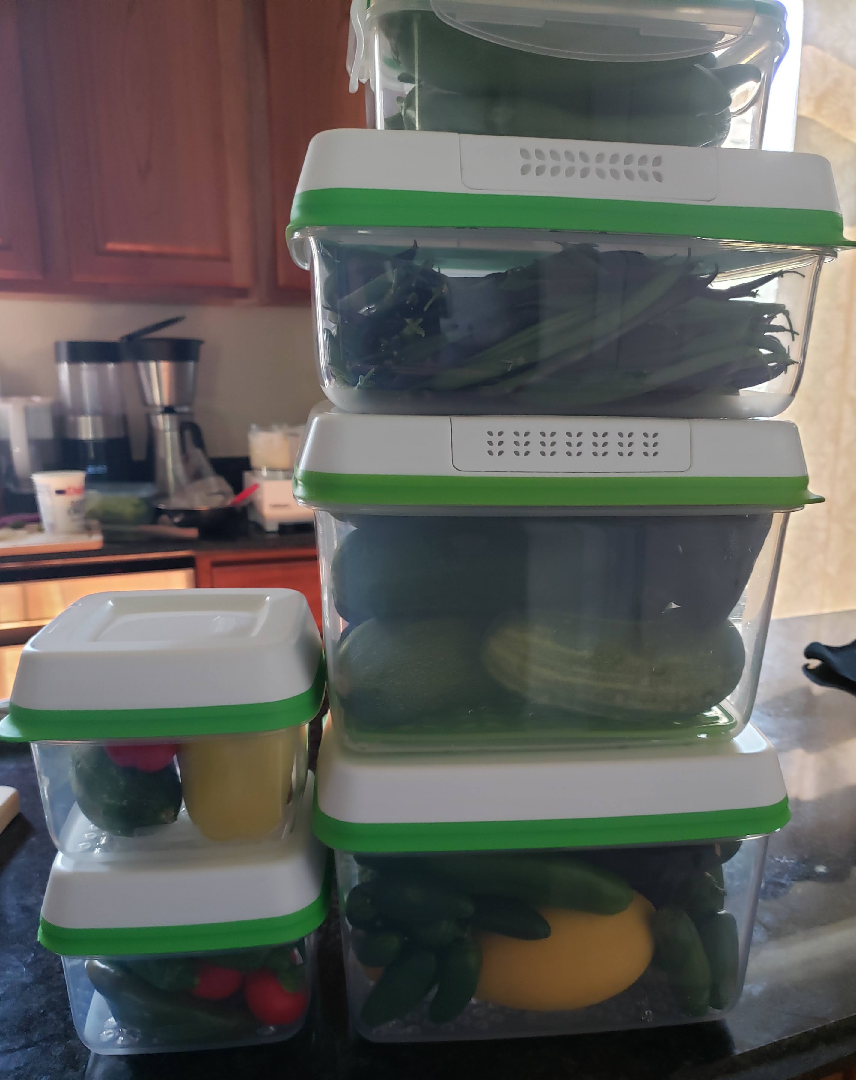 I have several other older models as well, the ones with the little green tray on the bottom, but they all perform spectacularly!! I can keep zukes and squash in these for weeks on end, and they’re equally as good for the green beans, peppers. They are even great for cucumbers and berries, although they just don’t last as long as the rest, regardless of storage container.