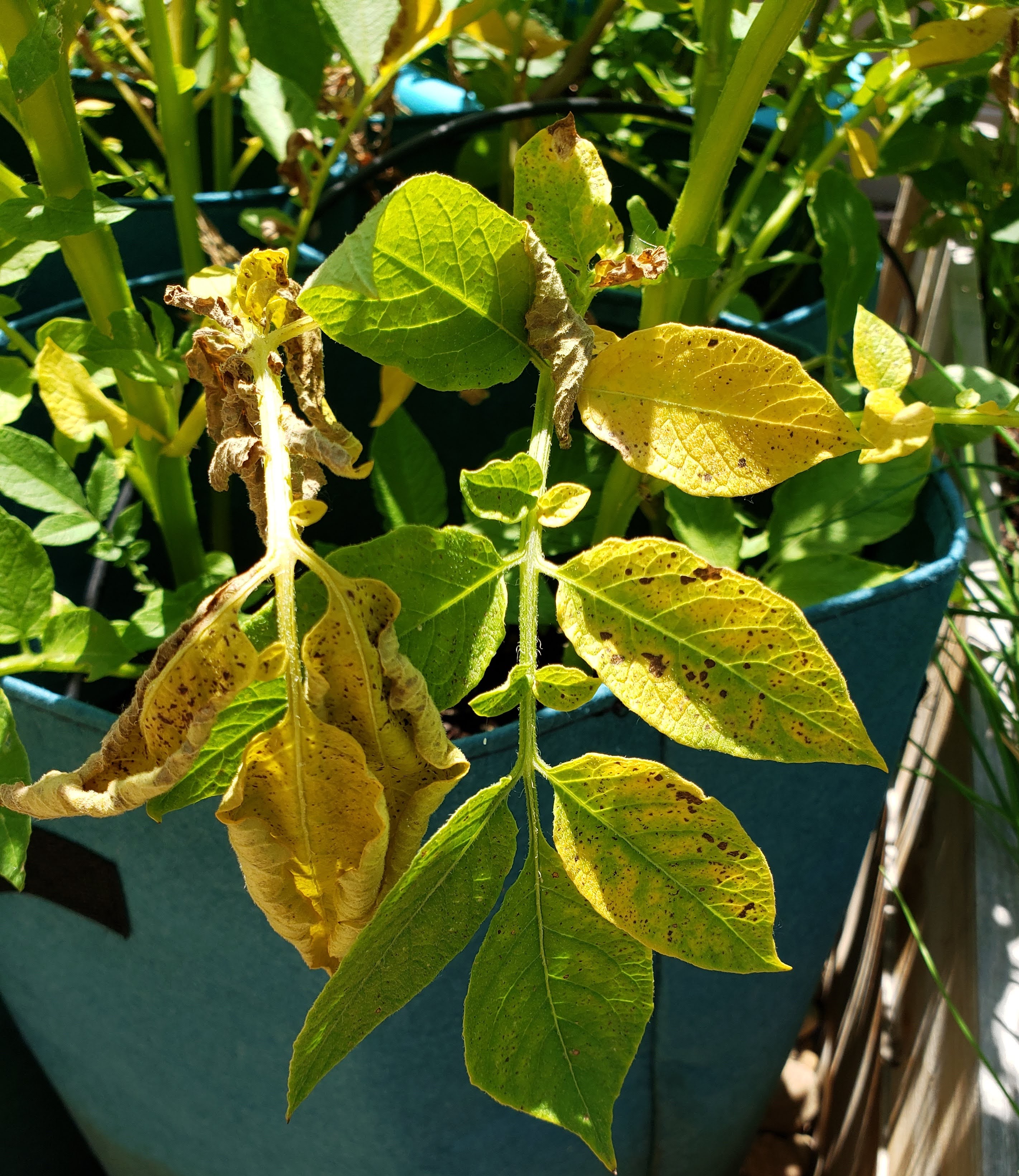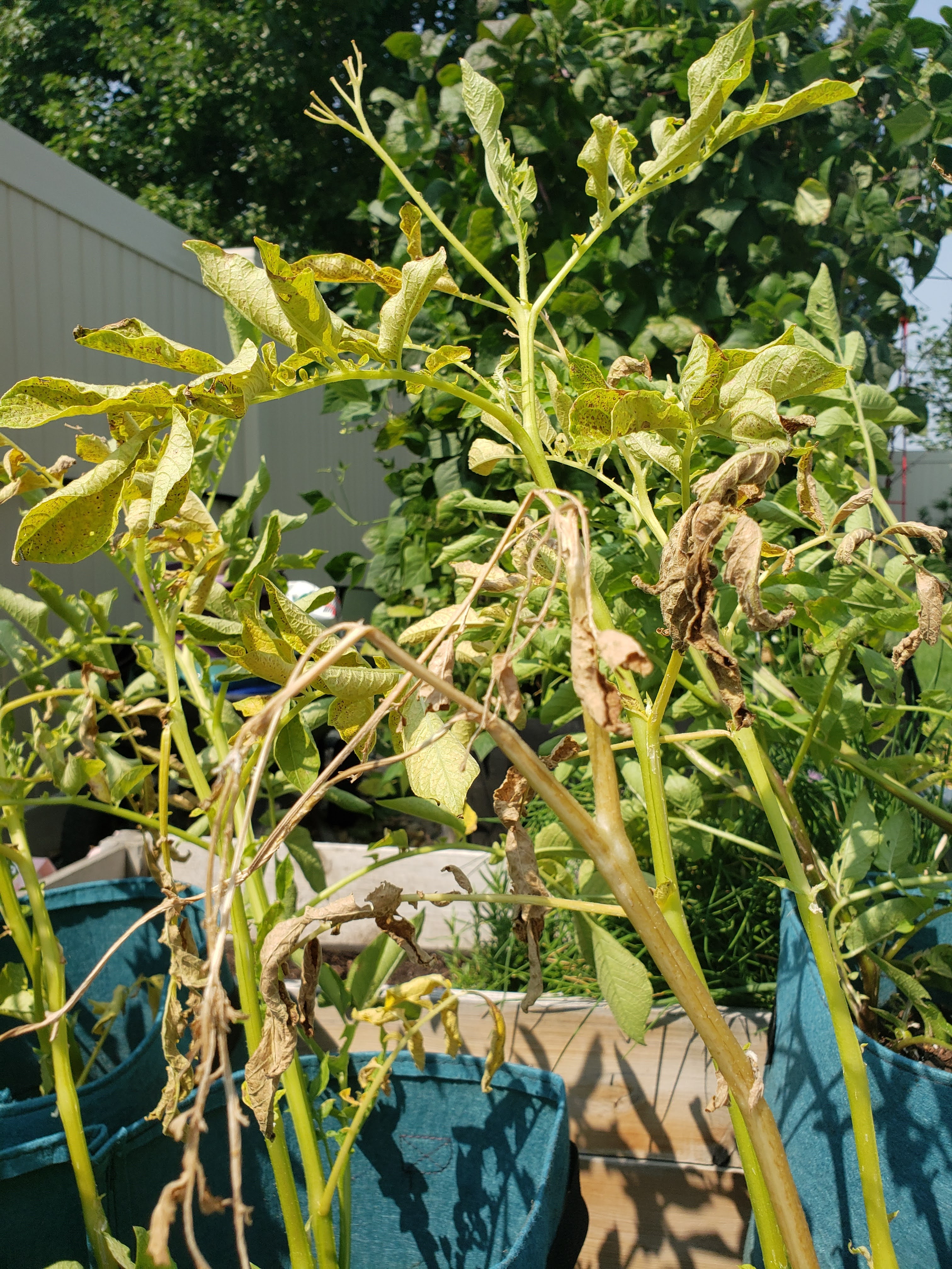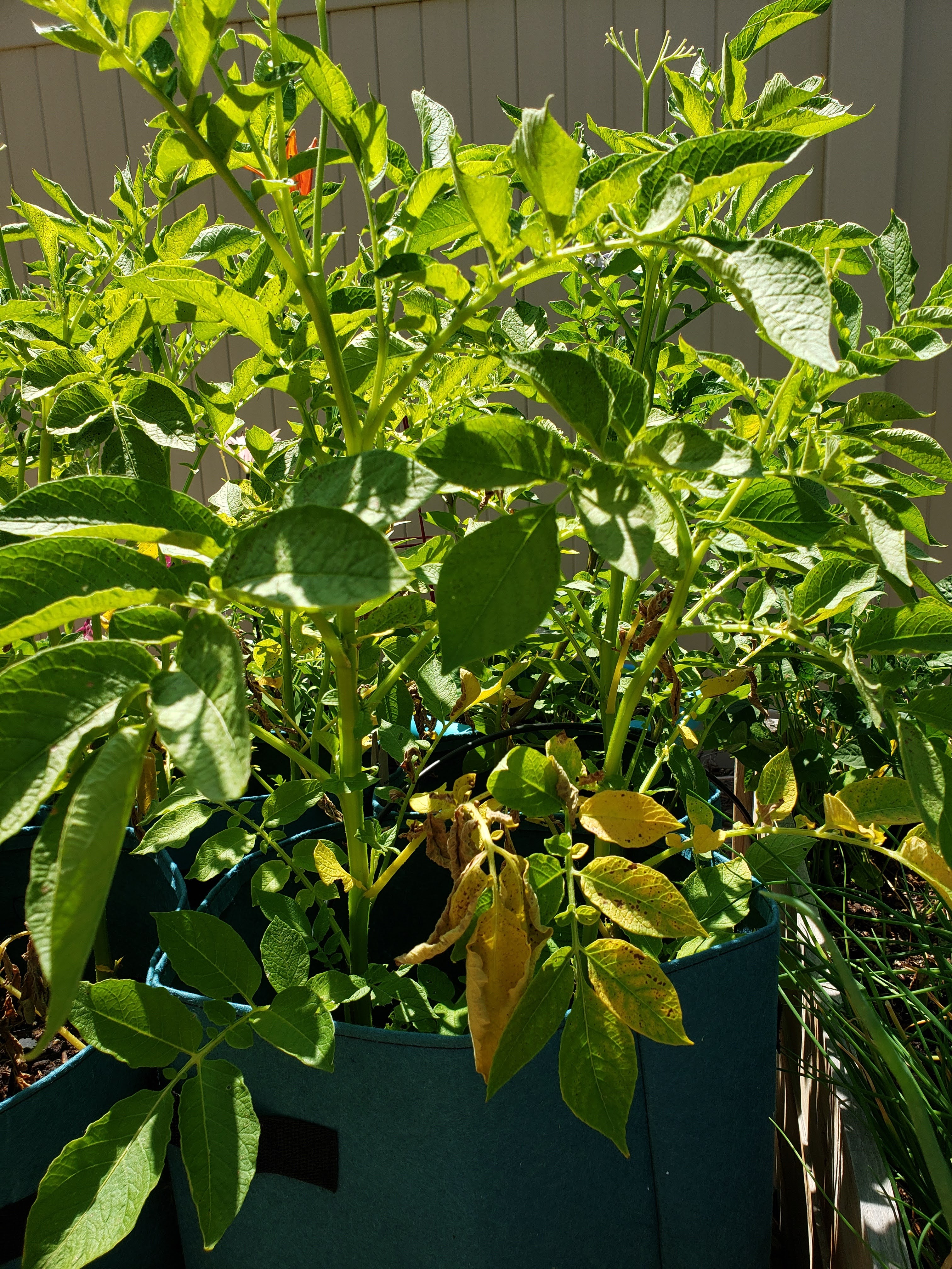 The potatoes are dead. I’ve not been able to find the reason. They started huge and beautiful and green and flowery. And then their leaves turned yellow and died. After much research and several attempts to fix them with nutrition – as there was no insect activity – I have come to believe it was fungal, viral, or bacterial in nature. See this earlier post for details: What’s STILL wrong with the potatoes?